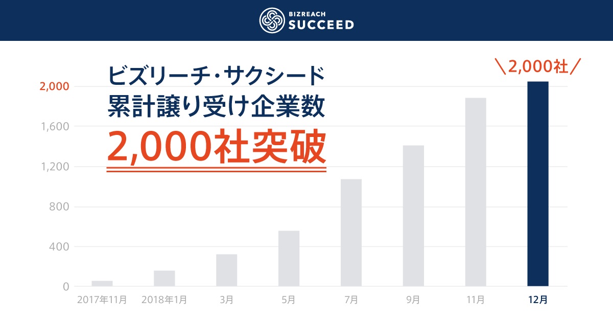 株式会社ビズリーチ(所在地:東京都渋谷区/代表取締役社長:南 壮一郎)が運営する、事業承継M&Aプラットフォーム「ビズリーチ・サクシード」(https://br-succeed.jp/)は、2018年12月13日に、累計譲り受け企業数が2,000社を突破しました。