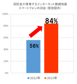 総務省の2013年の調査によると、高校生のスマートフォン利用は84%に上り、2012年の56%から大幅に増加しています。(※図1・注1参照)