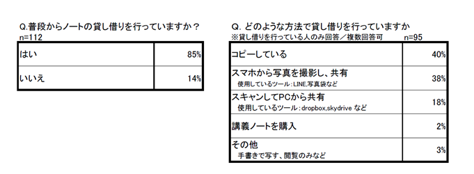 zuknowは新機能の開発にあたり、大学生112人にノートを利用した学習方法について調査を実施したところ、85%が「ノートの貸し借りを行う」と回答し、貸し借りの方法として、40%が「コピーを利用する」、38%が「写真を撮影しスマホを利用した共有する」と回答しました。(※図2・注2参照)