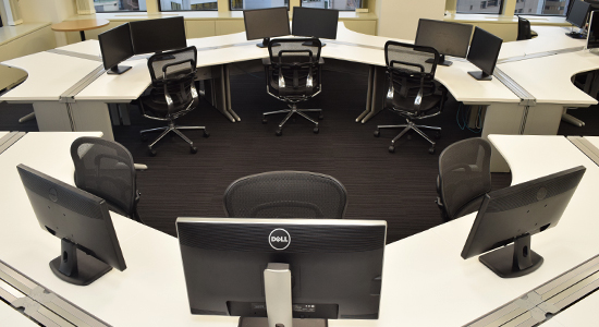 六角形に並べられたデスクのフロアで、後ろを振り返ればすぐにチームでコミュニケーションをとれます。