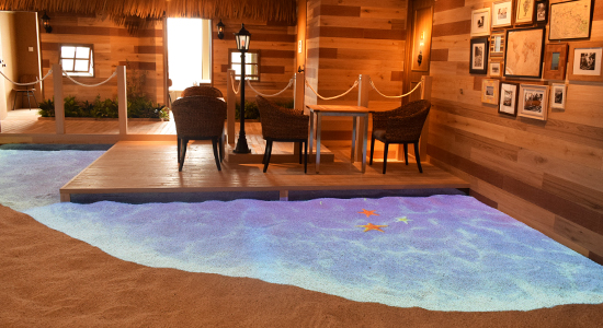 「3DCG バーチャルリアリティ」を使用し、沖縄から取り寄せた2トンのサンゴ砂に海の映像を投影しています。海に手をかざすとセンサーが反応して、波紋が広がり、「ちゃぽん」と音が出る仕組みです。