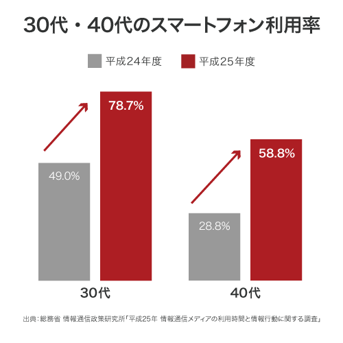 くわえて、総務省 情報通信政策研究所の調査によると、2014年度は2013年度に比べ、30代と40代のスマートフォン利用率が大きく増加していることから、スマートフォンでの情報収集も増加していくことが考えられます。