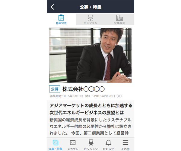 本アプリは、ハイクラス人材に向けたキャリア形成に関わる情報を閲覧できたり、プロフィールを登録後に採用企業やヘッドハンターとチャット形式でコミュニケーションをとることも可能です。