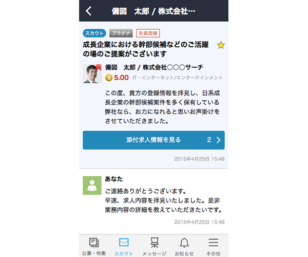 プロフィールを登録すると、採用企業やヘッドハンターから、直接スカウトが届きます。登録ユーザーはスカウトに対して、チャット形式でコミュニケーションも可能です。
