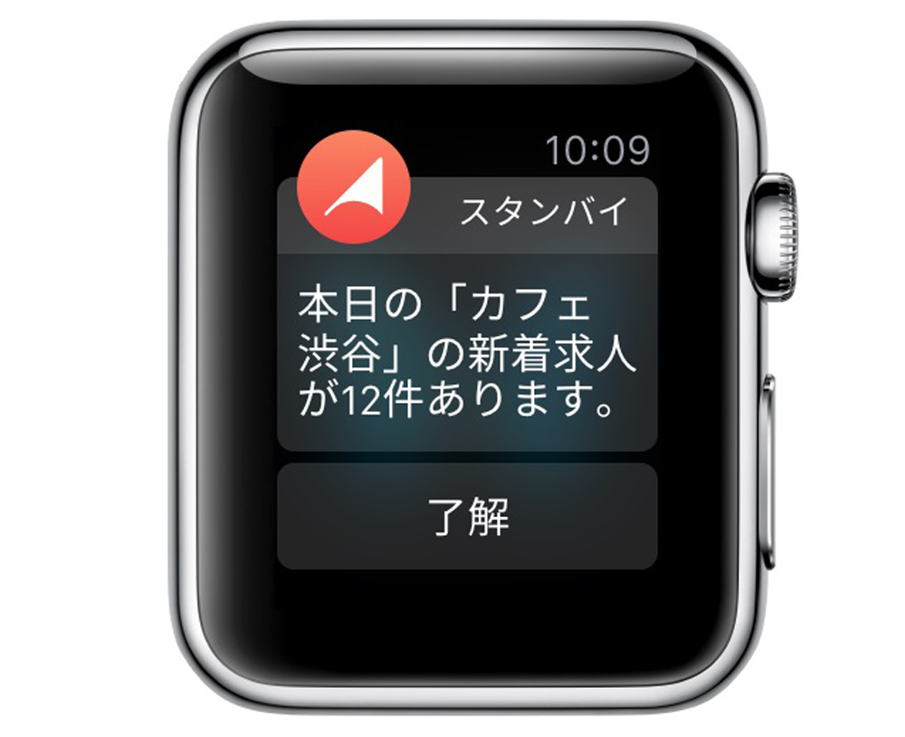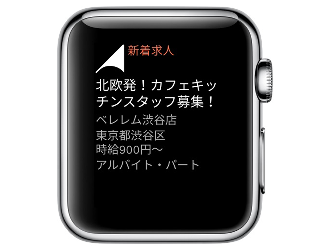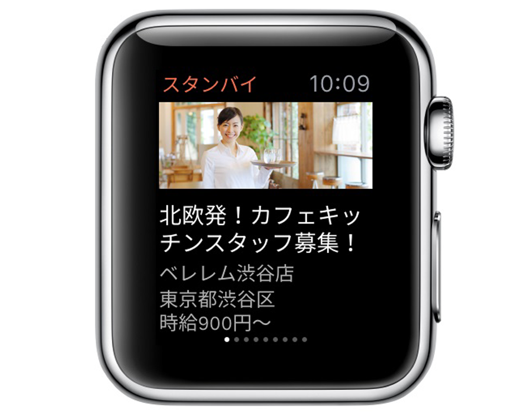 また、Apple Watchにも対応し、職種・勤務地・給与・雇用形態など、保存している求人検索条件の検索結果から、新着の求人上位10件を閲覧できるようになりました。また、気になった求人情報があった場合は、「キープ」ボタンをタップすると、後でiPhoneなどで詳しい情報を確認することもできます。これにより、ユーザーが関心のある条件の新着求人を見逃さずに確認できるようになります。また、Apple Watch のGlance(グランス)機能を使って新着求人を閲覧することもできます。