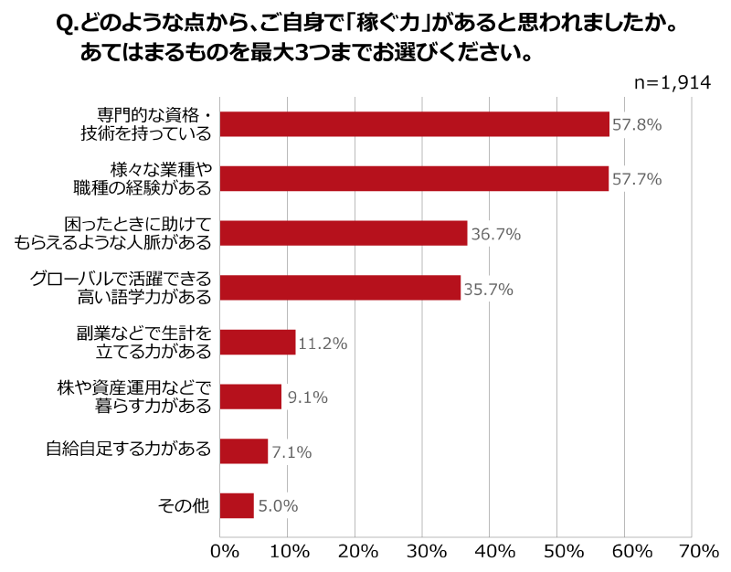 今回のアンケート調査で、7割以上のビジネスパーソンが自身に「稼ぐ力がある」と回答し、「稼ぐ力がある」と回答した理由としては、「専門的な資格・技術を持っている」(57.8%)、「様々な業種や職種の経験がある」(57.7%)、「困ったときに助けてもらえるような人脈がある」(36.7%)「グローバルで活躍できる高い語学力がある」(35.7%)という回答が多く、「副業などで生計を立てる力がある」(11.2%)、「株や資産運用などで暮らす力がある」(9.1%)などのような、副収入を得る力があるということよりも、個人の経験や専門的な資格を持つことを「稼ぐ力」と捉えていることが明らかになりました。