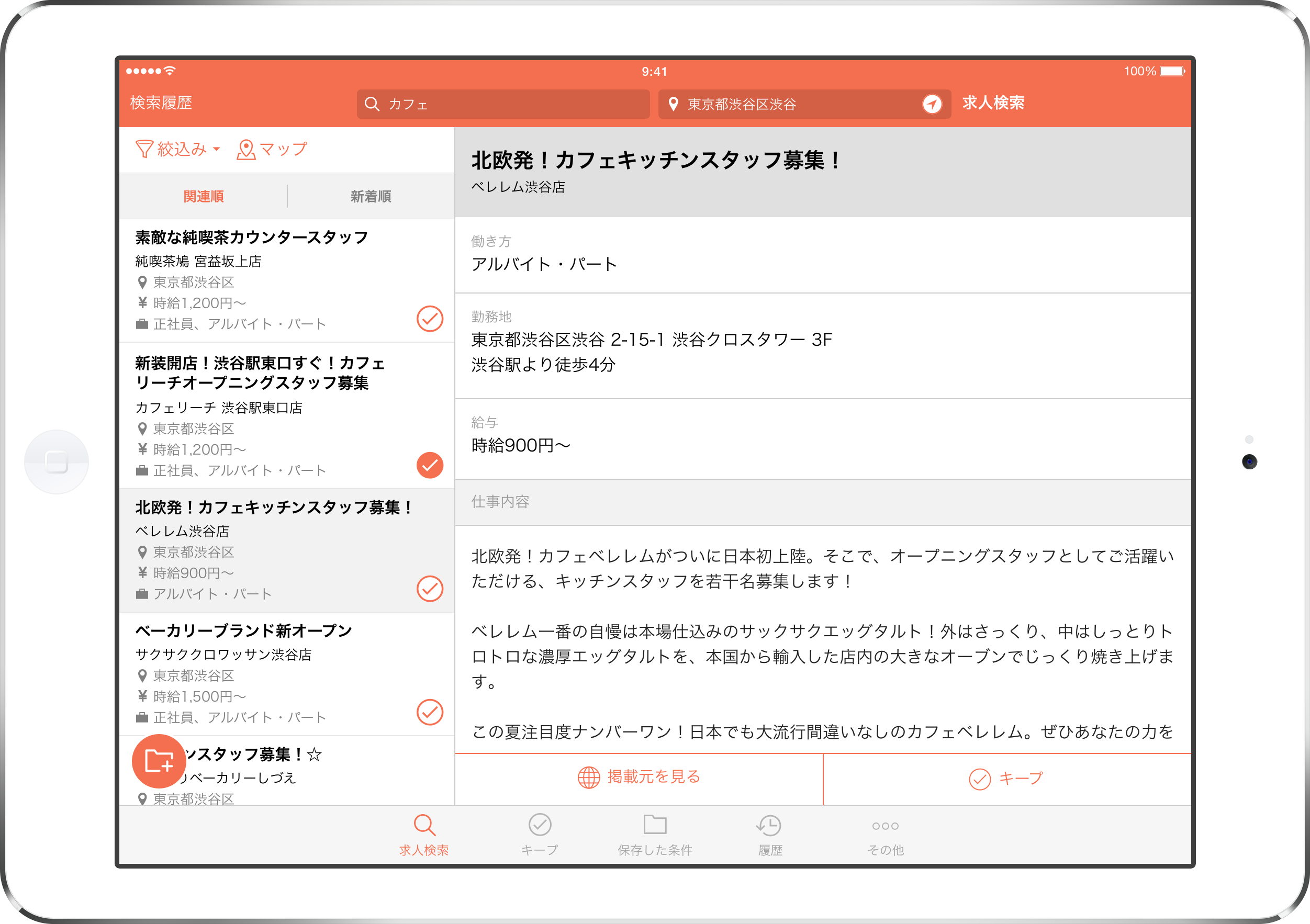この他、検索結果をテキストのみで表示する場合、ページで画面左側の検索結果一覧の求人をタップすると、右側にその求人の詳細が表示されます。一画面で検索結果一覧と求人詳細を表示できるため、最小限のページ遷移でスムーズに求人を検索できます。
