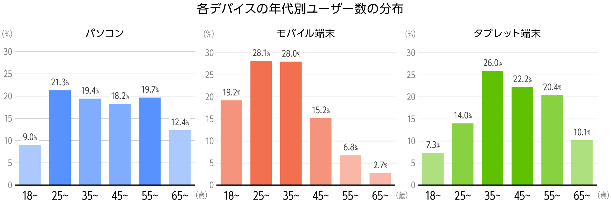 また、デバイスごとに年代別利用状況を見たところ、タブレット端末は30代後半以上、モバイル端末は10代~30代、パソコンは20代~50代が中心で、年代によって利用するデバイスが異なる傾向にあることがわかりました。