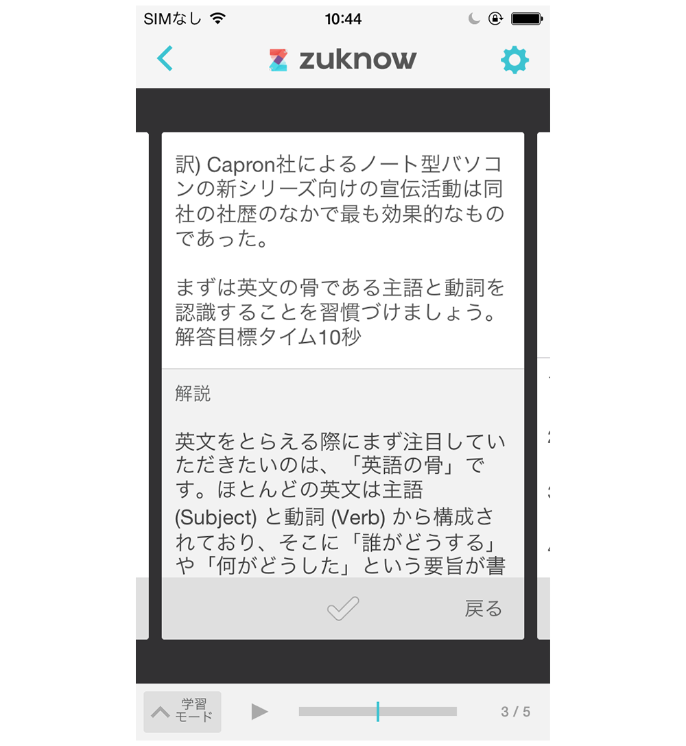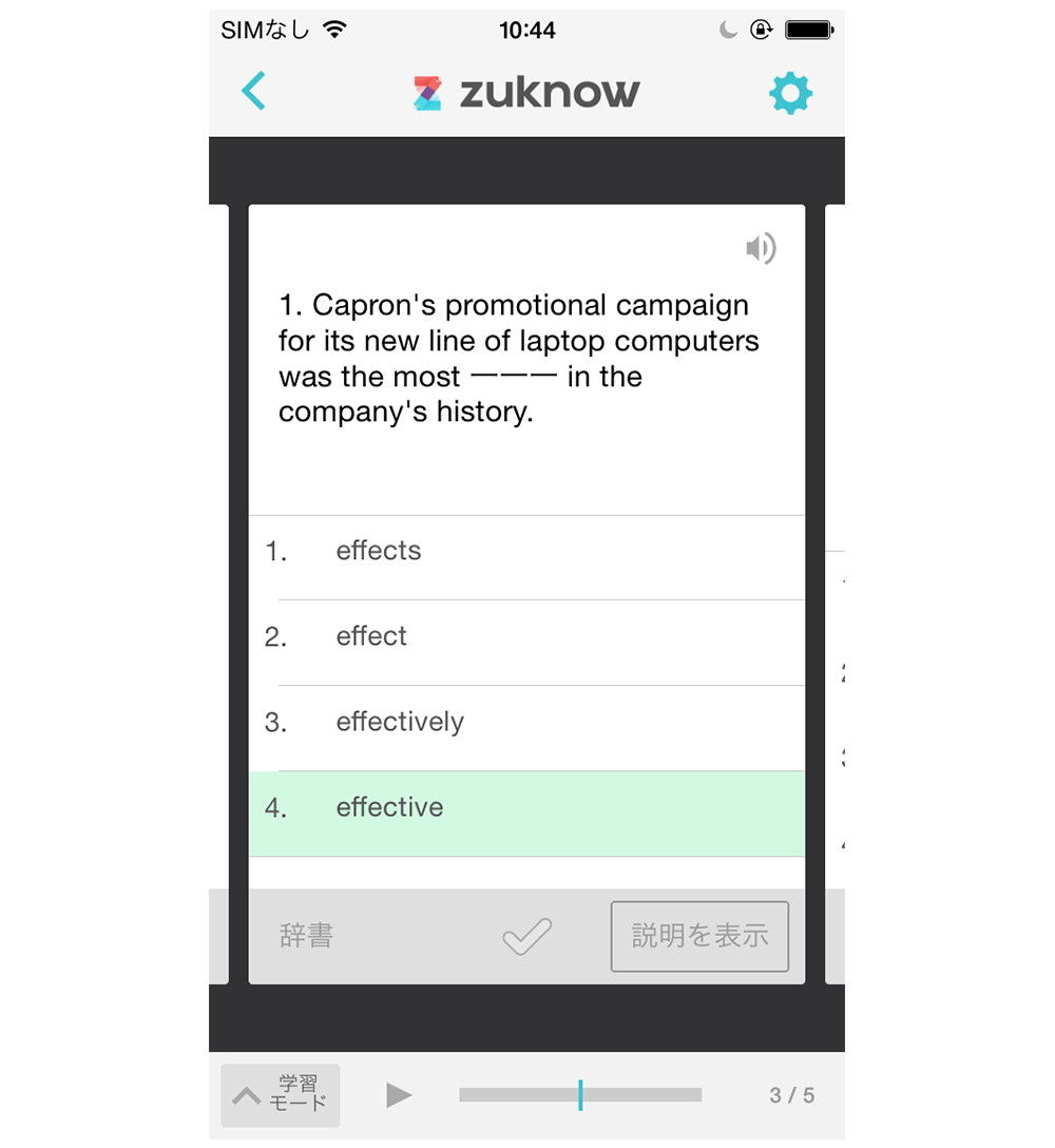書籍の『新TOEIC®TEST 文法特急2 急所アタック編』がアプリのコンテンツになったことで、本書の魅力はそのままに、zuknowならではのクイズ機能や音声読み上げ機能でさらに高い学習効果を得られるようになりました。書籍と同様に、不正解選択肢についても、その理由を詳しく解説しているため、身につきやすく学習効果の高い内容となっています。