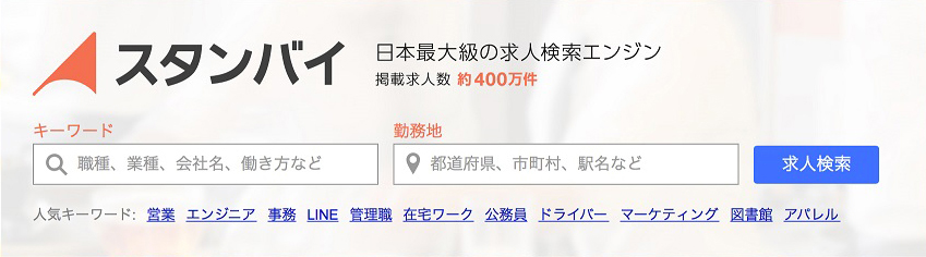 スタンバイは、国内の全業種・全職種・全雇用形態を対象にした日本最大級の求人検索エンジンで、Webブラウザ版とスマートフォンアプリ版があります。複数の大手求人サイトの求人を横断して一括検索できるのが特徴で、求職者は、スタンバイの検索窓に仕事に関する「キーワード」と希望の「勤務地」を入力することで、いつでもどこでもPCやスマートフォンから求人を検索できます。掲載求人件数は約400万件。企業は、無料で求人情報を作成・公開・管理でき、採用成約時の追加手数料も必要ありません。