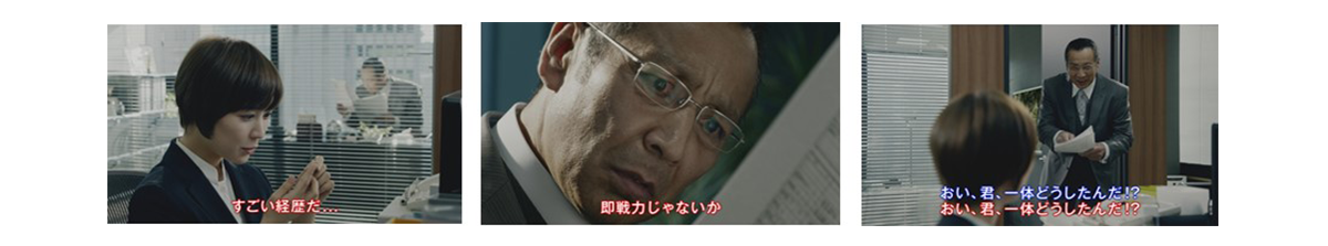 書類に目を通すや否や、社長の目が変わります。「すごい経歴だ…・・・」。そんな社長の心の声を代弁していく女子社員。