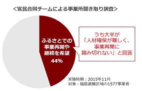 福島相双復興官民合同チームが2015年に実施した調査では、約44%の事業所が「ふるさとでの事業再開や継続を希望」と回答する一方で、その大半が「人材を確保するのが難しく、事業再開に踏み切れない」と回答しています。