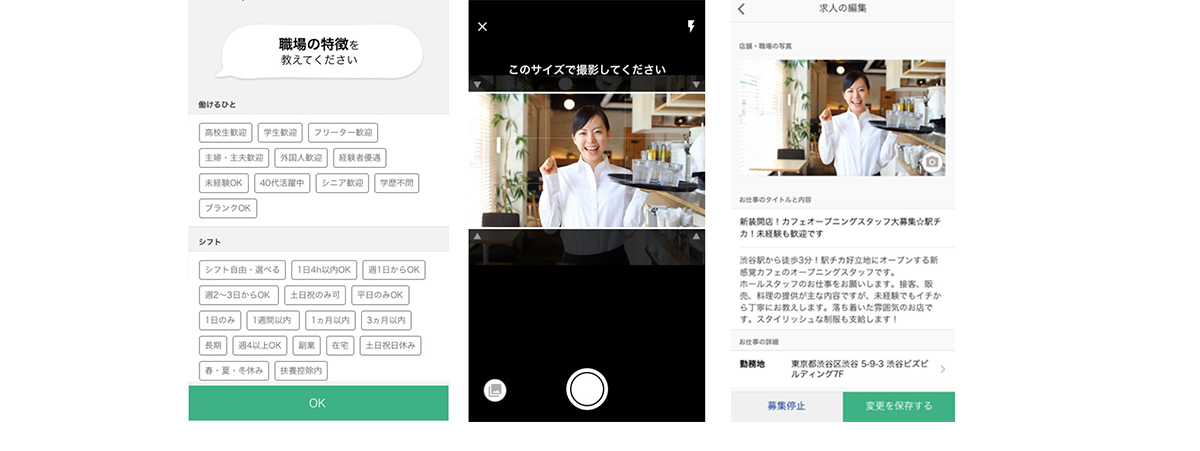 スマートフォンから写真撮影も! 約3分で簡単に求人掲載