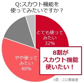 また、企業・店舗に「スカウト機能」を使ってみたいかどうか質問したところ、8割が「使ってみたい」と回答。理由としては「スピーディーな採用」はもちろん「仕事内容や求めるスキルに合致する人材を採用できそう」「今まで応募してくれなかったような人材にアプローチできそう」と、採用数が伸び悩むなか、より条件にフィットした人材の獲得に期待をよせる声が多くありました。