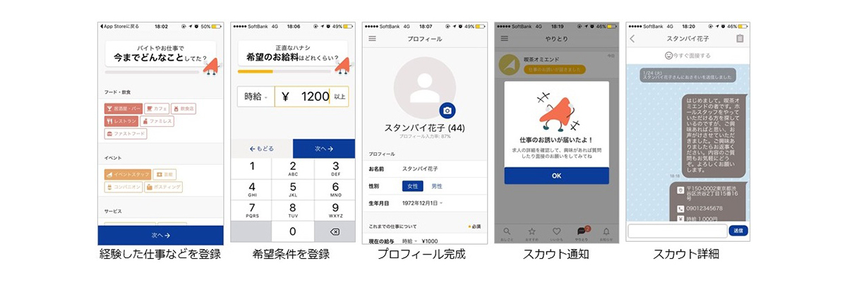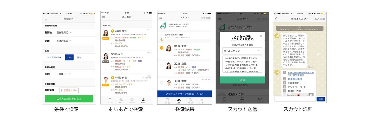 求職者はそれまでに経験した仕事、これからやりたい仕事、現状の給与、希望の給与、性別、生年月日、名前、写真といったプロフィールを登録すると、企業・店舗から面接を希望する「スカウト」が届き、そのなかから興味のある仕事を選択できます。これにより求職者は仕事探しの手間を省けるだけでなく、それまで自分では選ばなかったような仕事・条件に出合える可能性が高まります。