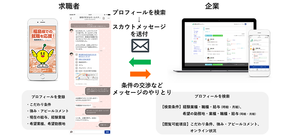 また、求職者が本アプリで経験業種や強み・アピールコメント等の簡単なプロフィールと希望条件(給与・業種・勤務地)等を登録するだけで、その求職者に興味をもった企業から「スカウト」が届きます。その後、求職者は企業と条件に関することなどをチャットで質問や確認することができ、面接前から柔軟でスピーディーな交渉が可能です。この他、企業からスカウトされた場合は、スマートフォンで動画面接も行えます。これにより求職者は仕事探しの手間を省けるだけでなく、自分では探せなかった仕事や条件に出合える可能性が高まります。特に、東日本大震災の影響により、現在も避難地域に移住している求職者が、震災前に住んでいた地元地域など遠隔地の求人を探している場合、スマートフォンを使って遠い地域の求人を探せるだけでなく、採用面接も多額の交通費をかけて移動することなく受けることができます。同時に企業も、求職者からの応募を待つだけでなく、スカウトすることで直接求職者にアプローチできるため、スピーディーな採用と、それまでリーチできていなかった求職者層との接点を持つことが可能になります。