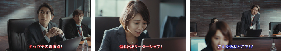 今回の CM は、中途入社の社員が、会議室でプレゼンテーションの準備をしている場面から始まります。見慣れないその社員に気づいた事業部長(神尾 佑さん)が、「ねぇ、彼…」と様子をうかがうと、隣にいた社員(吉谷 彩子さん)が中途採用で入社した人物だと教えます。