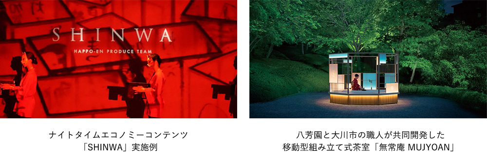 一方で、少子化や挙式披露宴の実施率低下などの影響により、挙式・披露宴・披露パーティー市場規模は4年連続で縮小しています(※3)。このようななか、ウエディング事業を大きな柱としてきた八芳園は、今後の収益を支える新たな事業の柱を確立するべく、2016年ごろからインバウンドに関するプロジェクトを強化してきました。具体的な取り組みとして、2017年に福岡県大川市と包括的連携協定を締結し、訪日外国人に向けた日本文化体験の提供、および地域活性化の向上を図っています。また、訪日外国人旅行者増加のカギともいわれる、ナイトタイムエコノミー(日没から日の出までの夜の時間帯の経済活動)の活性化にも着目し、「SHINWA」という日本の神話をモチーフとしたコンテンツを企画するなど、より多くの訪日外国人を呼び込む施策を実施しています。さらに、観光庁が訪日旅行の促進に合わせて強化している「MICE」の誘致活動も積極的に行っています。