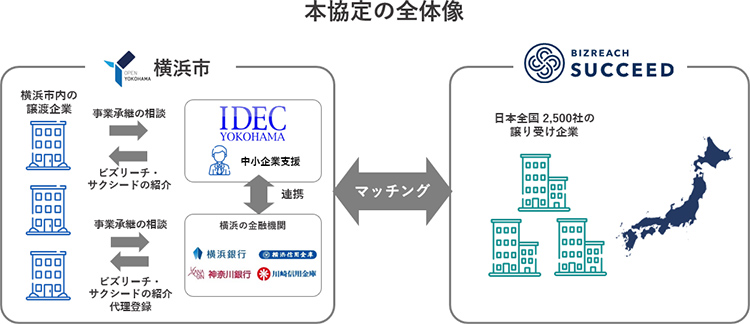 ビズリーチと横浜市、IDEC横浜が、市内事業者の事業承継課題を解決するため、金融機関と連携して、事業承継支援に取り組みます。