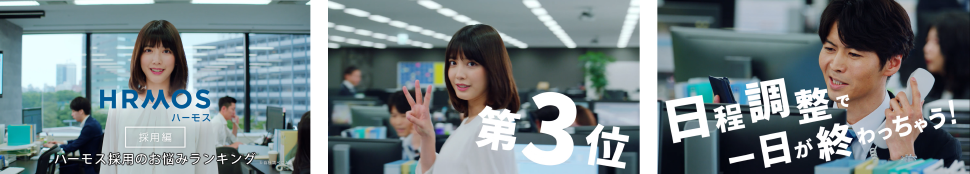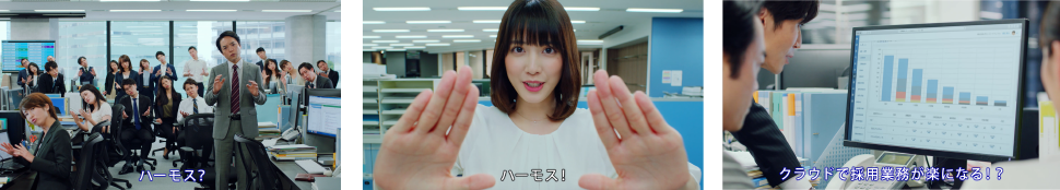 今回のターゲットは、日々採用業務に追われている人事部。そんな彼らに「HRMOS(ハーモス)」という初めて聞く名称と、サービス内容を好意的に認知してもらうことが、このCMを制作するうえで大きなポイントでした。そこで人事部の方々が持つ悩みを、ランキング形式でCM冒頭に組み込み、共感を得るような構成にしています。主演は、オーディションを勝ち抜いた新進気鋭の女優、松田るかさん。彼女が持つフレッシュな魅力と、ハーモスが持つ先進性が相まって、とてもポジティブなCMが完成しました。要所で決まる「ハーモスポーズ」の、堂々とした立ち姿にも大注目です。ハーモス!