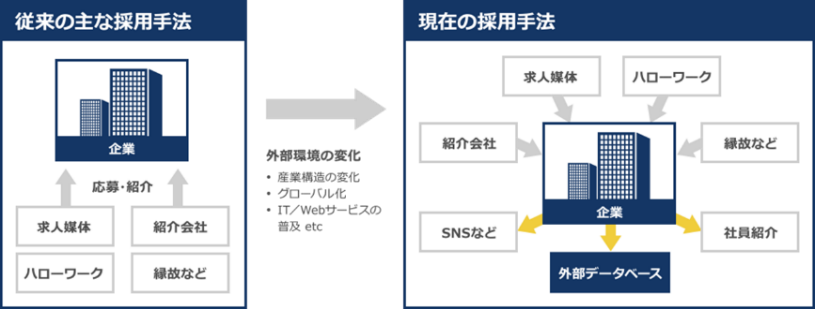 昨今、新規事業やグローバル展開など成長が見込める新たな分野で活躍できる即戦力人材を、中途採用する企業が増えています。特に製造業においては、産業用ロボットやIT技術の進歩による技術革新を背景に、即戦力人材の採用ニーズが急激に増えており、人材獲得競争が激化しています。そのようななか、多くの企業が主体的・能動的な採用活動「ダイレクトリクルーティング」の重要性を強く認識し、採用変革に取り組んでいます。