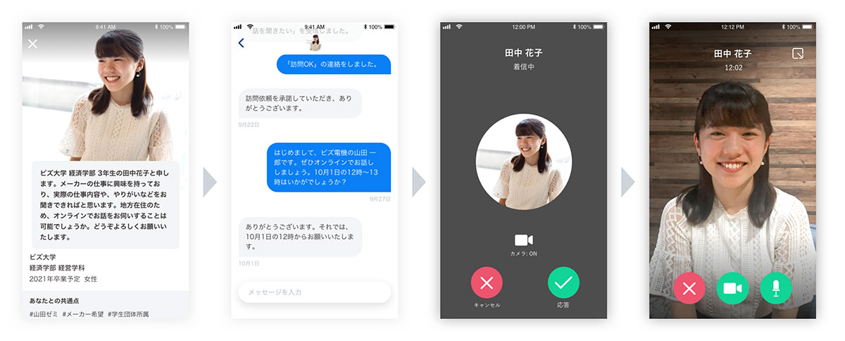 これまで対面のOB/OG訪問ができない場合は、外部のビデオ通話サービスを立ち上げ、お互いのIDなどを伝える必要がありましたが、「オンラインOB/OG訪問」機能を使えば、OB/OG訪問の依頼からオンライン訪問まで、ビズリーチ・キャンパスのサービス上で完結できます。