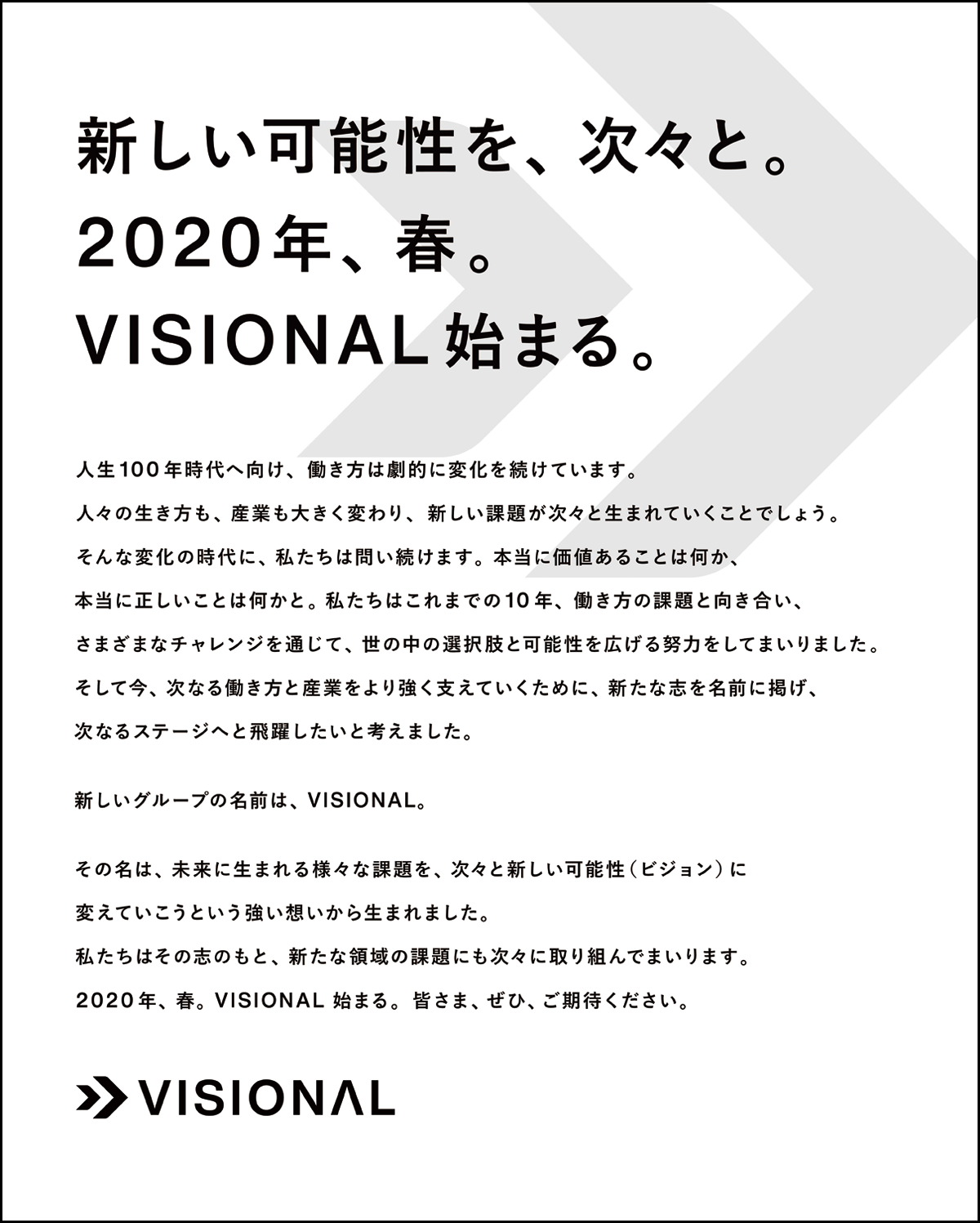 Visionalという社名には、未来に生まれるさまざまな課題を、次々と「新しい可能性(=ビジョン)」に変えていこうという私たちの強い思いが込められています。グループとして、事業成長や事業創造のスピードを加速し、働き方や産業の未来を支えていきたいと思います。