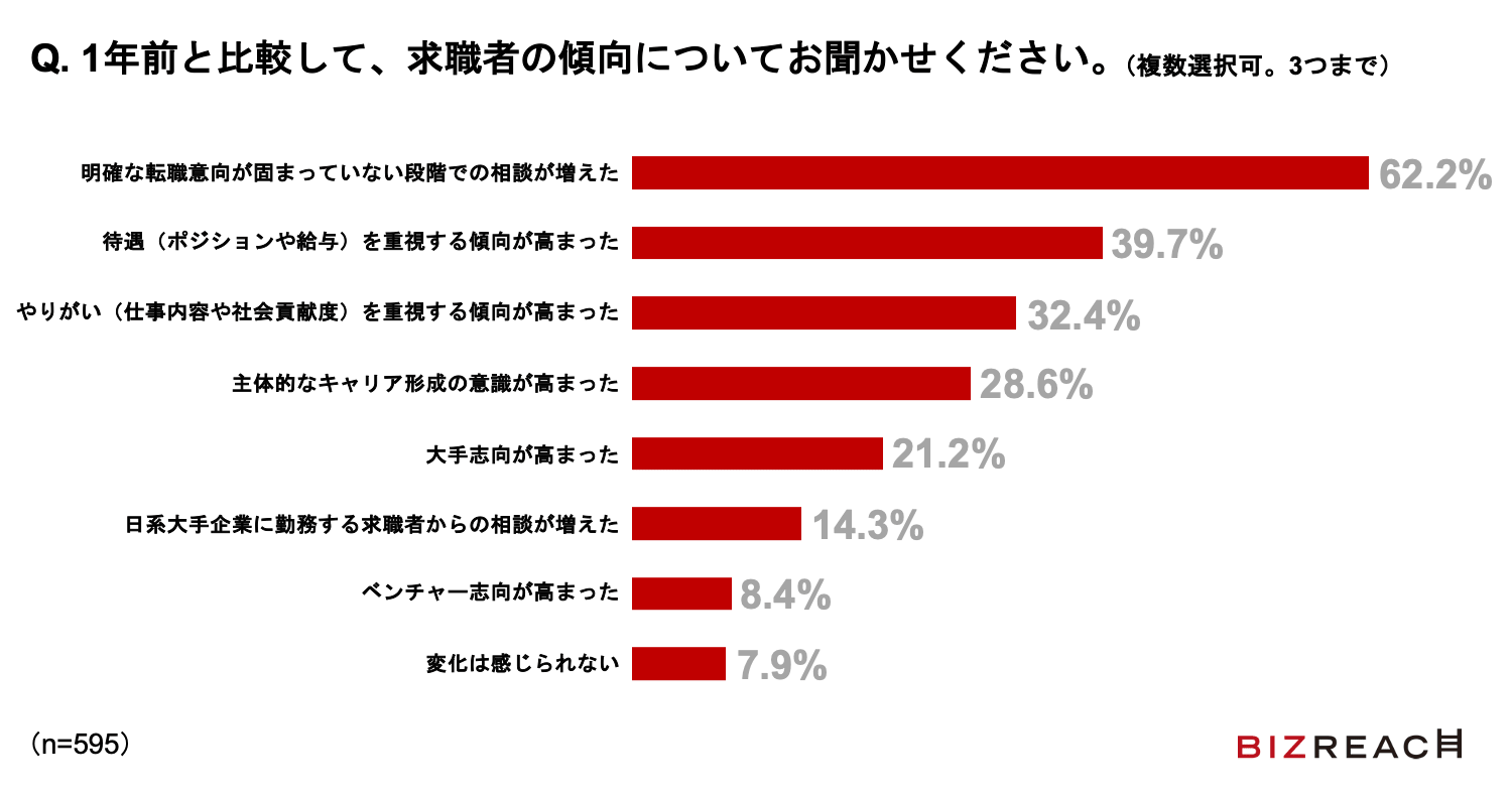 ヘッドハンターに、1年前と比較した求職者の傾向について質問したところ、「明確な転職意向が固まっていない段階での相談が増えた(62.2%)」が最も多い結果となりました。さらに、「主体的なキャリア形成の意識が高まった(28.6%)」や「日系大手企業に勤務する求職者からの相談が増えた(14.3%)」という傾向が明らかになりました。この結果より、ビジネスパーソンが自身のキャリアの選択肢や可能性を広げるために、転職意向が固まる前から中長期的に活動をしていることが分かります。また、自身のキャリアを主体的に構築していくための、セルフキャリアマネジメント意識が高まっていることがうかがえます。