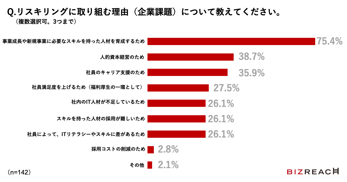 またリスキリングに取り組む理由(経営課題)について質問したところ、「事業成長や新規事業に必要なスキルを持った人材を育成するため(75.4%)」が最も多い結果となり、「人的資本経営のため(38.7%)」「社員のキャリア支援のため(35.9%)」が続きました。「社内のIT人材が不足しているため」も26.1%となりました。