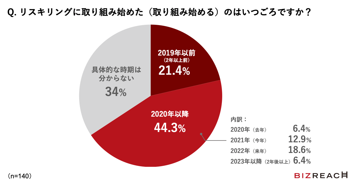 リスキリングに取り組み始めた(取り組み始める)時期については、コロナ禍以前(2019年以前)が21.4%だったのに対して、コロナ禍以降(2020年以降)が44.3%という結果になりました。また具体的な時期については、来年(2022年)からの実施予定が約2割となる一方で、具体的な時期は分からない企業も約3割ありました。