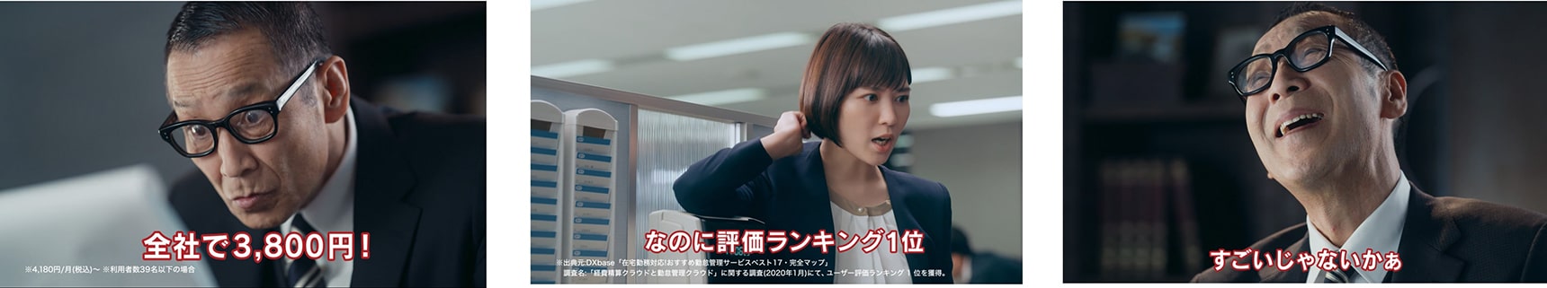 ナレーションで、「HRMOS勤怠」が全社で月額3,800円から利用できることを紹介。最後に、社員全員で「さよならタイムカード!」という掛け声と共に社員が持っていたタイムカードを手放し「ハーモス勤怠!」をアピールします。