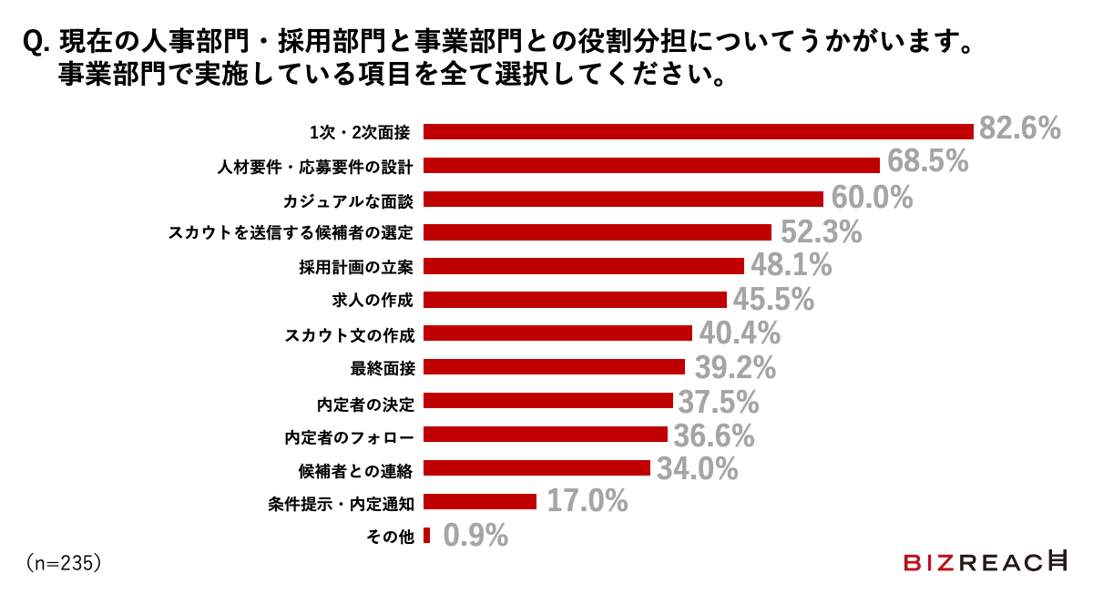 事業部門が採用に関わることのメリットとして「選考時のミスマッチが防げること」や「採用したい人材要件が明確になる」などが挙げられ、既に人事部門と事業部門が連携して採用活動を行う企業が多くあります。しかし、現在の人事・採用部門と事業部門との役割分担について質問したところ、事業部門が実施している項目としては「1次・2次面接」「人材要件・応募要件の設計」など選考に関する内容が高い結果となり、「スカウトを送信する候補者の選定」は52.3%、「スカウト文の作成」は40.4%にとどまりました。また、事業部門が中途採用業務に関わるなかでの課題は、「採用業務を行う時間をとりにくい」が59.2%と最も高い結果となりました。