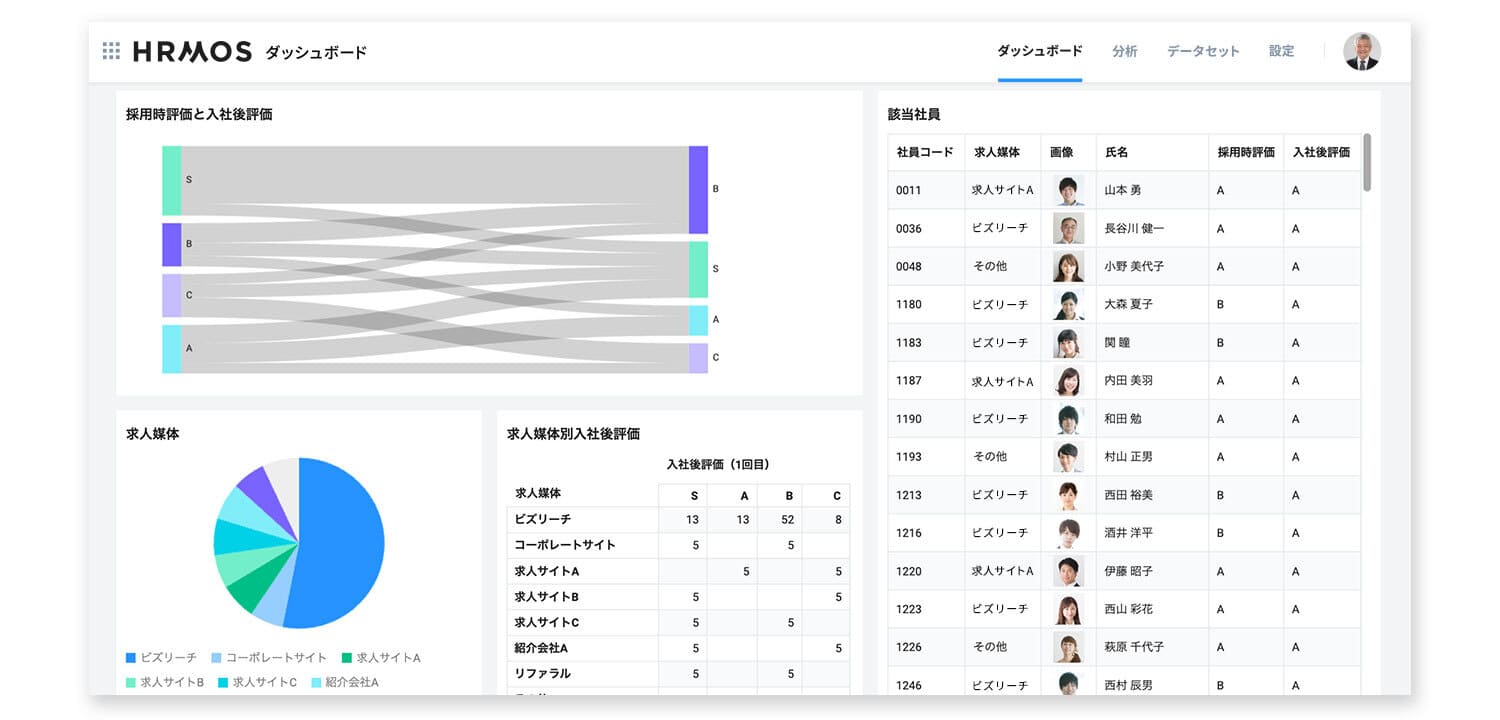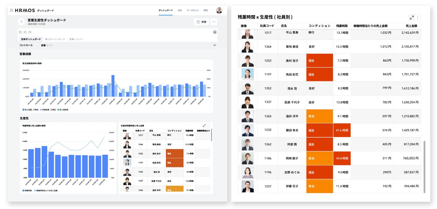 カスタム分析の例として、活躍人材やマネージャー候補となる育成候補者のモニタリング(退職リスクやパフォーマンス分析等)をはじめ、採用した人材の「採用時評価と入社後評価の比較」や「採用経路別の入社後評価」等が可能となり、早期離職を防ぐ採用オンボーディングについて分析できます。その他にも、残業時間などの勤怠データと、営業成績のデータを従業員データにひもづけて、個人・組織単位での「営業生産性ダッシュボード」を構築できます。