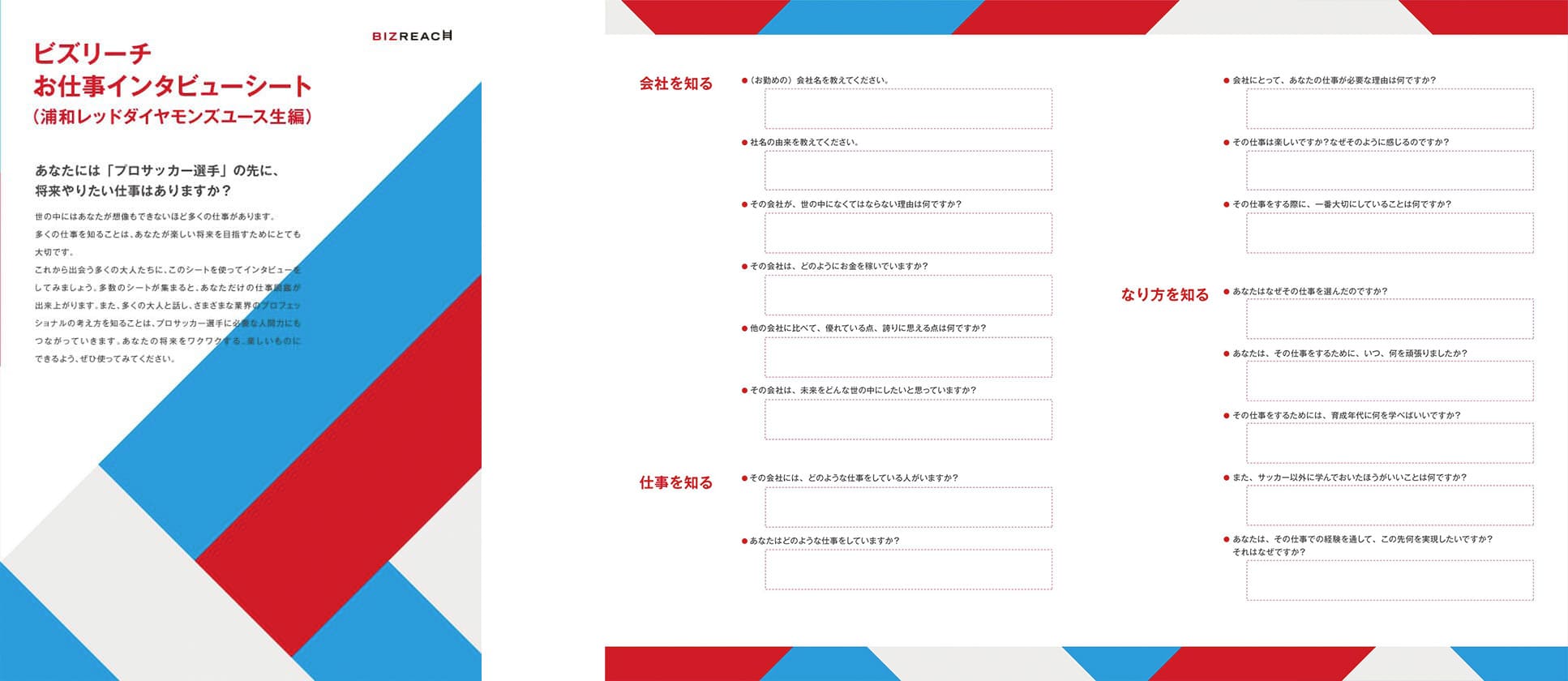 このたび、ビズリーチと共に「キャリア教育プログラム」の開発に至り、プログラムの提供に先駆けたイベントを開催しました。本イベントは、ユース選手がさまざまなキャリアを知る機会となり、「将来の選択肢を知ったうえで目の前の目標であるプロサッカー選手をどう目指すか」を考えるきっかけとなりました。本プログラムで活用される「お仕事インタビューシート」は持ち帰ることができ、ユース選手が帰宅後にも家族や知り合いの大人と一緒に活用することで、さまざまなキャリアの選択肢を知ることができるようになっています。このような取り組みが、浦和レッズのユース選手だけではなく、プロスポーツ選手を目指す人にも広がることを期待しています。