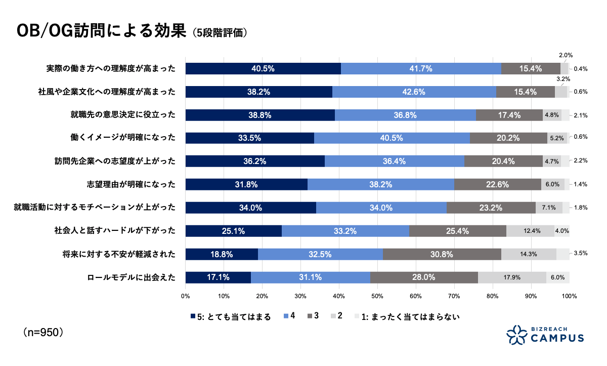 今回のアンケート結果から特筆すべきことは、OB/OG訪問の効果として、特に社風や企業文化、実際の働き方への理解度が高まったという項目が高くなっているのは、大量に流される情報の中でよりリアルな接点が貴重であることが裏付けられたという点です。これは企業にとっても人材確保のみならず入社後の定着にとっても大きなメリットであると考えられます。