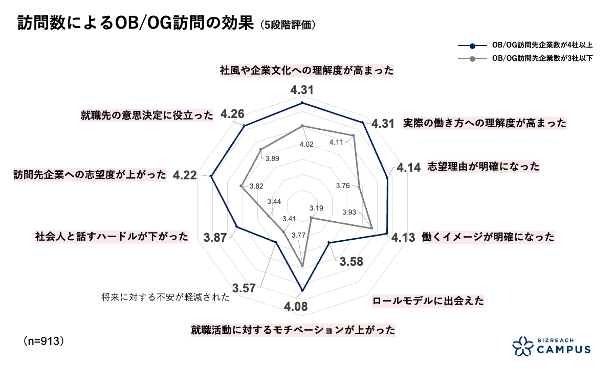 また、OB/OG訪問を実施した学生と実施しなかった学生を比較したところ、実施した学生のほうが内定獲得数が多く、特にOB/OG訪問先企業数が4社以上の学生のほうが、3社以下の学生に比べて内定獲得数がより多いことが分かりました。訪問先企業数が4社以上の学生は、「社風や企業文化への理解度が高まった」「実際の働き方への理解度が高まった」「ロールモデルに出会えた」「就職活動に対するモチベーションが上がった」など、訪問先企業に対する理解度や働くイメージの明確化、ロールモデルの発見、就職活動に対するモチベーションの向上などの指数※2で有意差が顕著となりました。