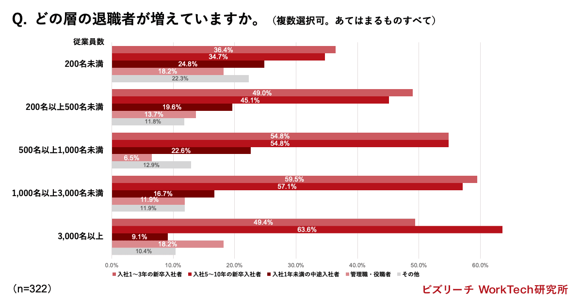 また、増加している退職者層についても企業規模によって差が見られます。従業員数200名未満の企業では、増加を感じる退職者層にばらつきがある一方で、従業員数3,000名以上の大企業では、「入社5~10年目の新卒入社者(63.6%)」「管理職・役職者(18.2%)」が、その他の規模の企業に比べて多い傾向が見られました。