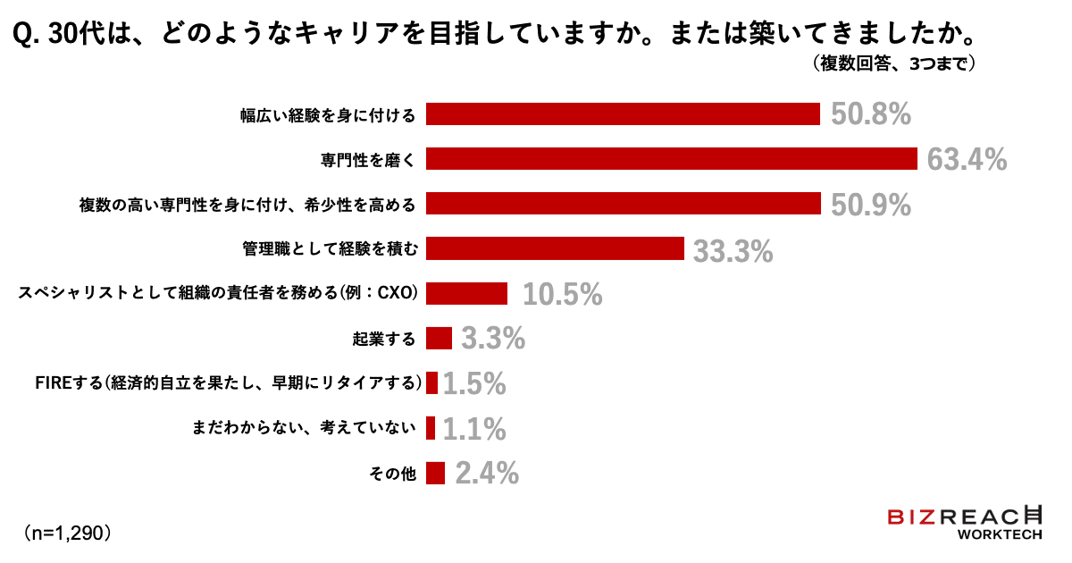 株式会社ビズリーチ(所在地:東京都渋谷区/代表取締役社長:酒井哲也)が運営する、働く人の活躍を支えるテクノロジー“WorkTech”に関する研究機関「ビズリーチ WorkTech研究所」は、ビズリーチ会員を対象に、年代別のキャリアの築き方に関するアンケート※を実施しました(有効回答数:1,290件)。その結果、20代は幅広い経験を身に付ける期間と位置付けるビジネスパーソンが多く、その後30代で専門性を磨き、40代で管理職として経験を積むことを重視するビジネスパーソンが多いことが分かりました。一方で、ビジネスパーソンの約7割が「現在所属している企業で希望のキャリアを築いていけない」と考えていることがわかりました。